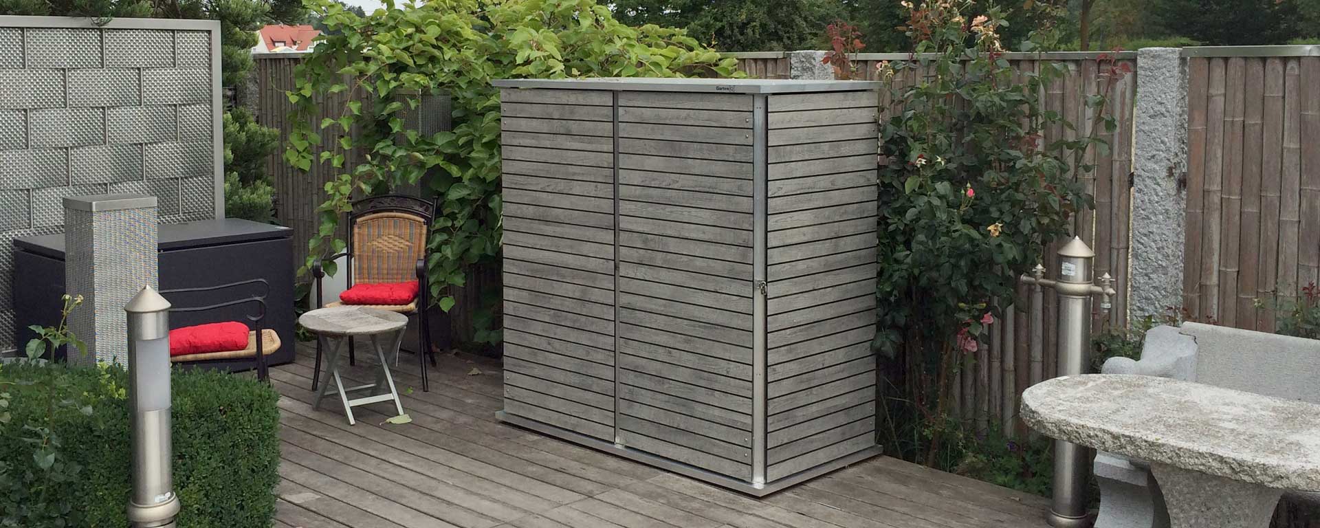 Auch mit einem Garten[Q]Trash, unserer Mülltonnenbox, lässt sich Ihr Gartenschrank verbinden. Dadurch erhalten Sie noch mehr Stauraum und Funktionalität. Lassen Sie sich über die Möglichkeiten beraten. Telefon: +49 (0)89 - 244 1841-0