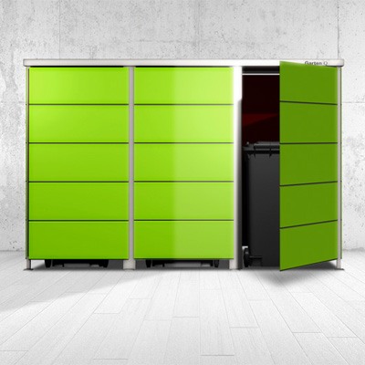 Drei Mülltonnen verstauen Sie im Garten[Q]Trash-3. Größe: 2,34 m x 0,82 m x 1,58 m oder 1,20 m (B x T x H). Sie können auch nur zwei Mülltonnen und eine integrierte Paketbox mit praktischen Regal für weitere Dinge unterbringen.