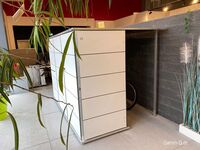 Ein Büro mit weißen Schränken, Pflanzen und einem schwarzen Hintergrund.